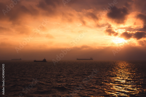 cargo ship outgoing from port at sunrise
