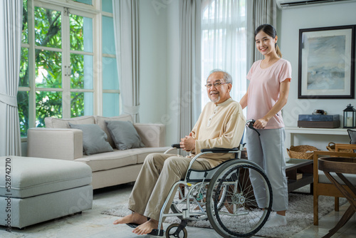 Caring daughter support assist positive father at home,Cheerful woman talking to old disabled father,Senior healthcare concept.