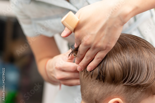 caring female hands of a mother with a comb and scissors make a fashionable haircut for her son at home during the second lockdown. selective focus