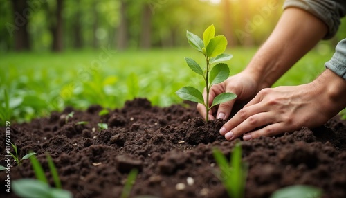 Caring Hands Planting Young Sapling in Rich Soil with Green Garden Background