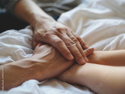 hand, hospital, bed, support, compassion, care, touch, comfort, intimacy, love, togetherness, connection, oneness, healing, warmth, wellness, emotion, human relationships, affection, partnership, bedside, patient, gesture, kindness, solace, presence, nurturing, empathy, communication, hope, friendship, bond, assistance, tenderness, collaboration, sympathy, reassurance, strength, serenity, calmness, vulnerability, peace, happiness, sharing, mindfulness, together, hugs