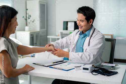 doctor, patient, hospital, health care, medicals, clinic, health, check-up, pulse, medicine, consultation, exam, diagnosis, treatment, care, professional, physician, practitioner, appointment, office, room, desk, table, sitting, talking, listening, communication, support, empathy, trust, wellness, disease, disease, injury, recovery, help, assistance, insurance, service, healthy, lifestyle, well-being, asian, woman, man, uniform, stethoscope, chart, document