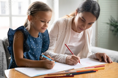 Caring young Caucasian mother and little teen daughter sit at table at home draw paint in album with pencils. Loving happy mom have fun enjoy learning hobby activity with small girl child together.