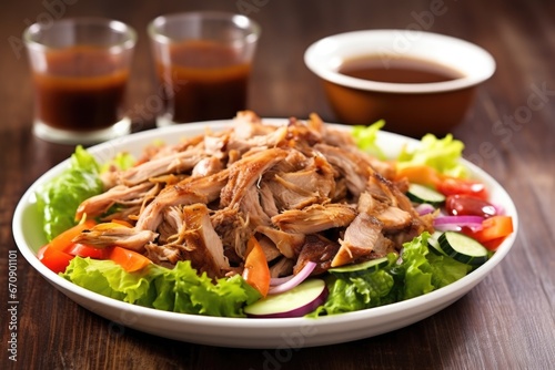 carolina pulled pork dripping with vinegar sauce placed over a salad