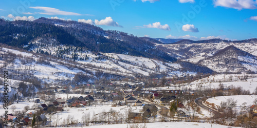 carpathian rural valley in winter. wonderful mountain landscape with village on a sunny day. snow covered fields on the hills