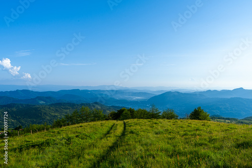 Carpathians mountains landscapes from green meadow on sunset, Apetska mountain, Ukraine
