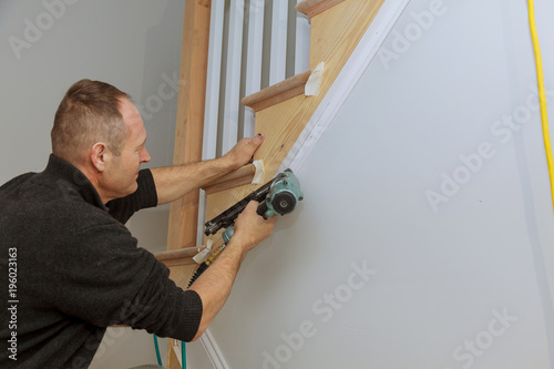 Carpenter brad using nail gun to Moulding trim, with the warning label that all power tools