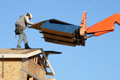 carpenter, wood, man, work, timbering, builder, house, roof, woodworker, building, home, tool, plywood, construction, constructing, build, industry, industrial, person, working, work, blue, forklift, orange, framing, eve, hard hat, framer, contractor, built, new home, new house