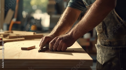 Carpenter building custom cabinets at a construction site. Featuring craftsmanship and focus