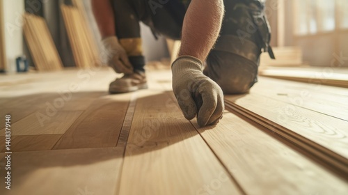 Carpenter installing wooden flooring at a construction site. Featuring craftsmanship and skill