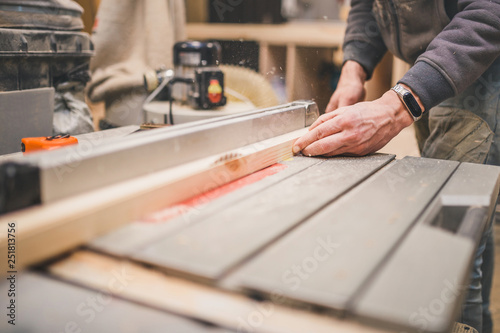 Carpentry workshop - carpenter works on a circular machine - cut bar