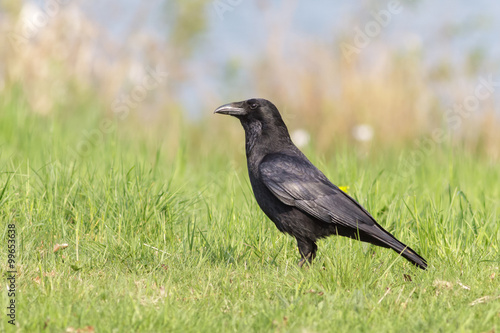grass, wetland, black, grassy, green, inquisitive, intelligent, meadow, passerine, profile, purple, sheen, half face, smart, water