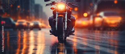 Cars and motorcycles on dimly lit road at night Copy space image Place for adding text or design