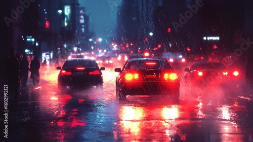 Cars drive through a rainy city street at night, with bright red taillights reflecting on wet pavement and silhouettes of pedestrians under umbrellas.