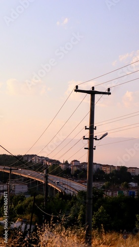 electricity, power, sky, energy, electric, line, cable, sunset, tower, landscape, voltage, wire, pylon, pole, blue, electrical, nature, field, line, high, grass, transmission, industry, road, powerline