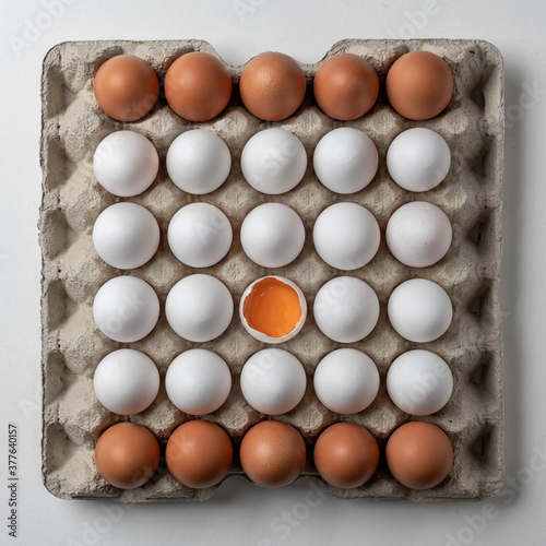 Carton of fresh brown and white eggs on white background