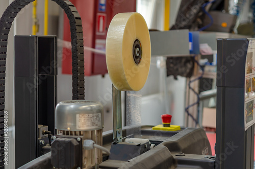 Carton packing machine, close-up view. Packaging production line. Part of the machine.