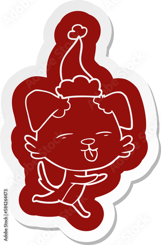 cartoon sticker of a dog sticking out tongue wearing santa hat
