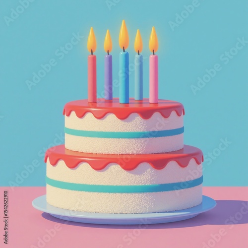 Cartoon 3D Layered Cake with Vibrant Frosting: Minimalist Double-Tier Design on Solid Background for Birthday Party and Digital Use
