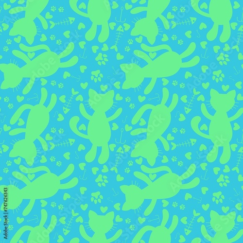 Cartoon animals accessories seamless cats and ball of threads and fish bones pattern for wrapping paper and fabrics
