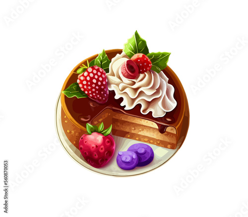 Cartoon cake with chocolate filling and berries. Vector illustration of a cake on a plate