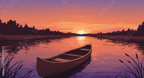 cartoon, canoe, river, sunset, warm tones, stylised, drawing, landscape, nature, illustration, art, simple, water, boat, scenic, relaxing, peaceful, minimalist, vignetting, digital artwork
