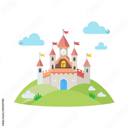 Cartoon Castle on the Hill: A whimsical cartoon castle with towering spires and flags fluttering in the sky, sits atop rolling hills, offering a glimpse into a land of fairytale wonder. See Less