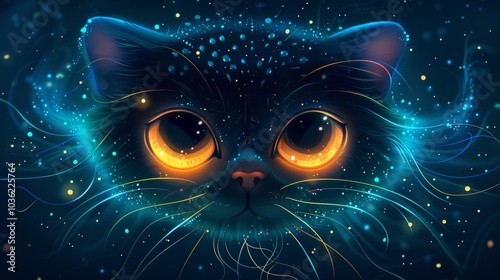 Cartoon cat face with a jellyfish, deep sea background