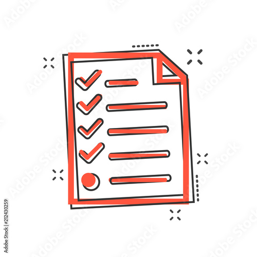 Cartoon checklist icon in comic style. Document check illustration pictogram. Diagram graph sign splash business concept.