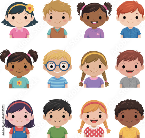 Cartoon children with diverse hairstyles and outfits, smiling characters in rows, playful educational illustration for diversity and classroom themes