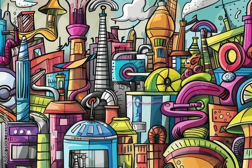 Cartoon cute doodles of a factory of imagination producing creative innovations, Generative AI