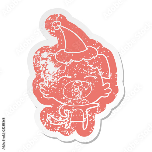 dog, animal, cartoon, distressed, grunge, old, worn, sticker, stick, decal, icon, signs, symbol, drawing, illustration, retro, doodle, freehand, free, hand, drawn, quirky, art, artwork, funny, character, pointing, santa, hat, christmas, christmas, wearing, festive