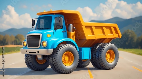 truck, dump, cartoon, vehicle, transport, road, highway, wheel, tire, blue, yellow, sunny, day, landscape, countryside, mountain, hill, sky, cloud, field, nature, rural, summer, exterior, automotive, construction, engineering, machinery, equipment, transportation, cargo, hauling, delivery, heavy, duty, power, industrial, toy, model, fun