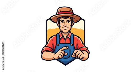 Cartoon farmer character wearing hat and overalls pointing at something.