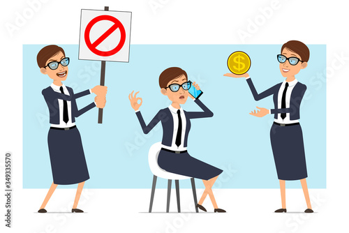 Cartoon flat funny business coach woman character in blue suit and glasses. Ready for animation. Girl holding no entry and dollar sign, talking on phone. Isolated on blue background. Vector set.