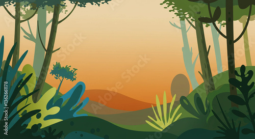 forest, landscape, tree, orange, sky, cartoon, nature, green, hill, foliage, vegetation, illustration, background, scenery, timberland, plant, environment, day, scene, view, wilderness, artwork, design, art, graphic, drawing, hill, botanical, flora, botany, leaf, branch, wood