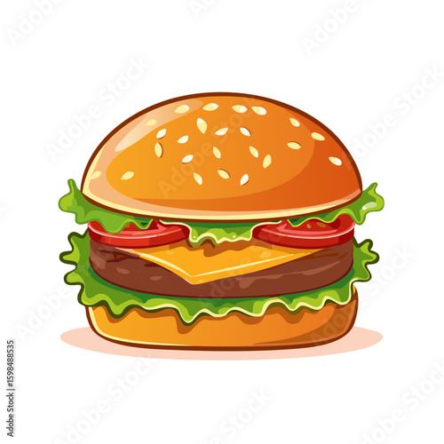 Cartoon Hamburger with Cheese, Tomato, and Lettuce, a Delicious Fast Food Icon