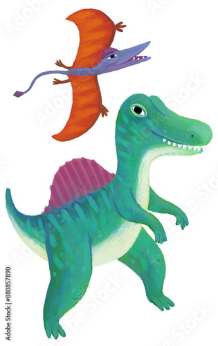 cartoon happy and funny colorful prehistoric dinosaur dino spinosaurus and quetzalcoatlus pterodactyl rhamphorhynchus bird flying isolated illustration for children