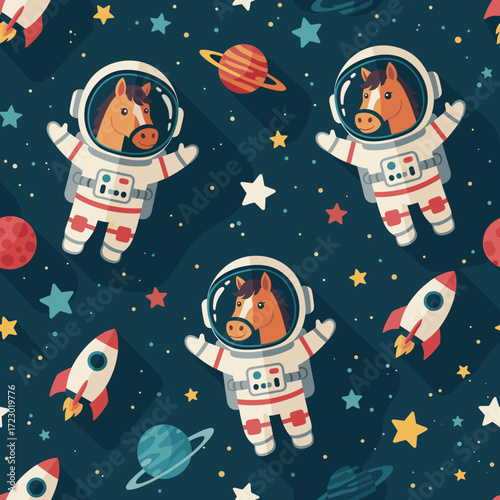 horse, astronaut, space, rocket, planet, star, cartoon, illustration, pattern, seamless, background, children, children, whimsical, fantasy, adventure, exploration, universe, cosmos, cute, imagination, dream, graphic, design, outer space