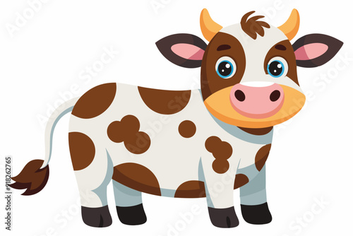 cow, cartoon, illustration, animal, farm, farm animal, mammal, brown, white, spot, hoof, tail, ear, horn, eye, blue, nose, pink, cute, friendly, happy, isolated, graphic, design, clip art, mascot, character, agriculture, dairy, milk, beef, grazing, pasture, field