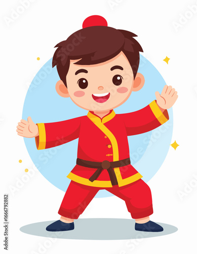 cartoon, children, boy, happy, smiling, chinese, martial, art, kung, fu, children, illustration, red, clothing, uniform, stance, black, belt, traditional, culture, asian, character, design, drawing, cute, isolated, figure, style, graphic, animation