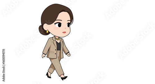 woman, cartoon, illustration, character, walking, business, suit, professional, attire, clothing, style, fashion, confident, determined, serious, face, expression, eye, eyebrow, lip, hair, bun, earring, necklace, gold, blazer, jacket, pant, shoe, heel, black, beige, brown, skin, light, figure, small, cute, adorable, simple, design, art, drawing, graphic, outline, isolated, white, background, studio