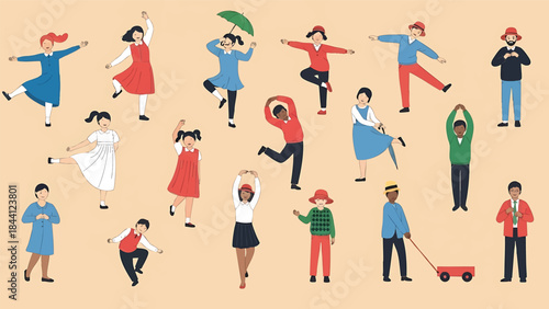character, variety, pose, dancing, activity, children, adult, vector, playful, cheerful, whimsical, colourful, drawing, art, hand-drawn, casual attire, fun, lifestyle, social, joyful, happiness, celebration, youth, recreation, together, community, togetherness, connection, friendship, diversity, multicultural, teamwork, well-being