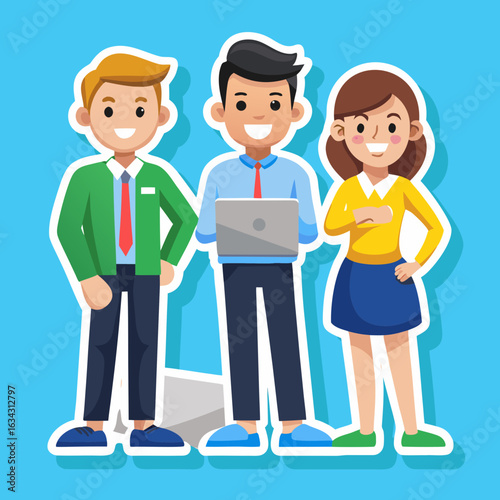 cartoon, illustration, team, teamwork, business, professional, people, man, woman, employee, office, work, laptop, smiling, happy, diversity, diverse, corporate, blue background, character, young, colleague, workplace, modern, casual attire, formal, success, presentation, meeting, group, together, cheerful, positive, red tie, green jacket, yellow shirt, company, organisation, collaboration, cooperation, staff, personnel, human resources