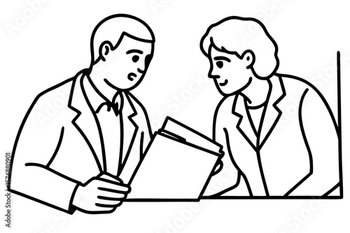 Cartoon Illustration of Two Businesspeople Discussing Document in Office Setting – Professional Collaboration and Workplace Communication Concept