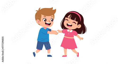 Cartoon illustration showcasing a joyful boy and girl holding hands while smiling with playful