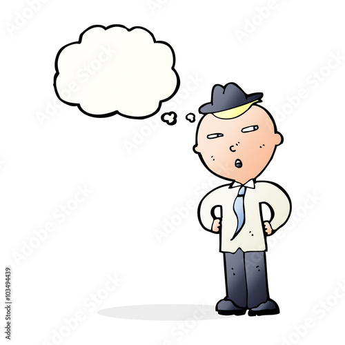 cartoon man wearing hat with thought bubble