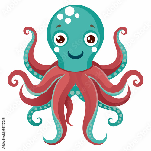 cartoon, octopus, sea, ocean, creature, animal, marin, underwater, cephalopod, invertebrate, 8, arm, tentacle, eye, smile, happy, cute, playful, friendly, colourful, blue, green, red, white, illustration, isolated, background, design, art, graphic, digital