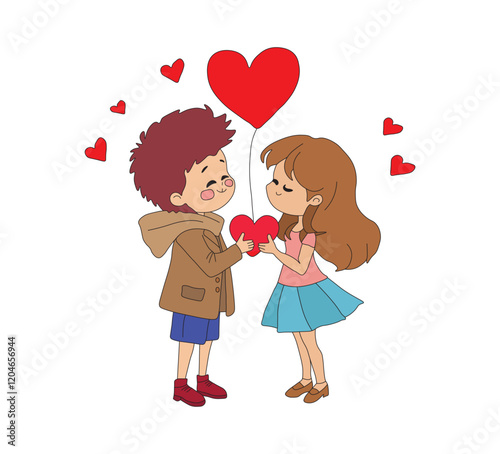 Cartoon of a Boy and Girl Holding a Heart Balloon. A delightful cartoon illustration of a boy and a girl holding a heart-shaped balloon together.