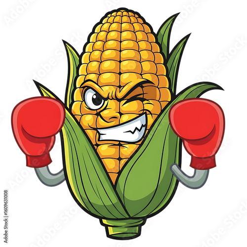 corn, maize, vegetable, food, healthy, nourishment, agriculture, cartoon, character, mascot, strong, power, boxing, glove, sport, fitness, athlete, competition, exercise, physical exercise, gym, fight, fighter, champion, winning, muscle, strength, determination, energy, farm, fresh, harvest, plant, growth, yellow, green, isolated, transparent, background